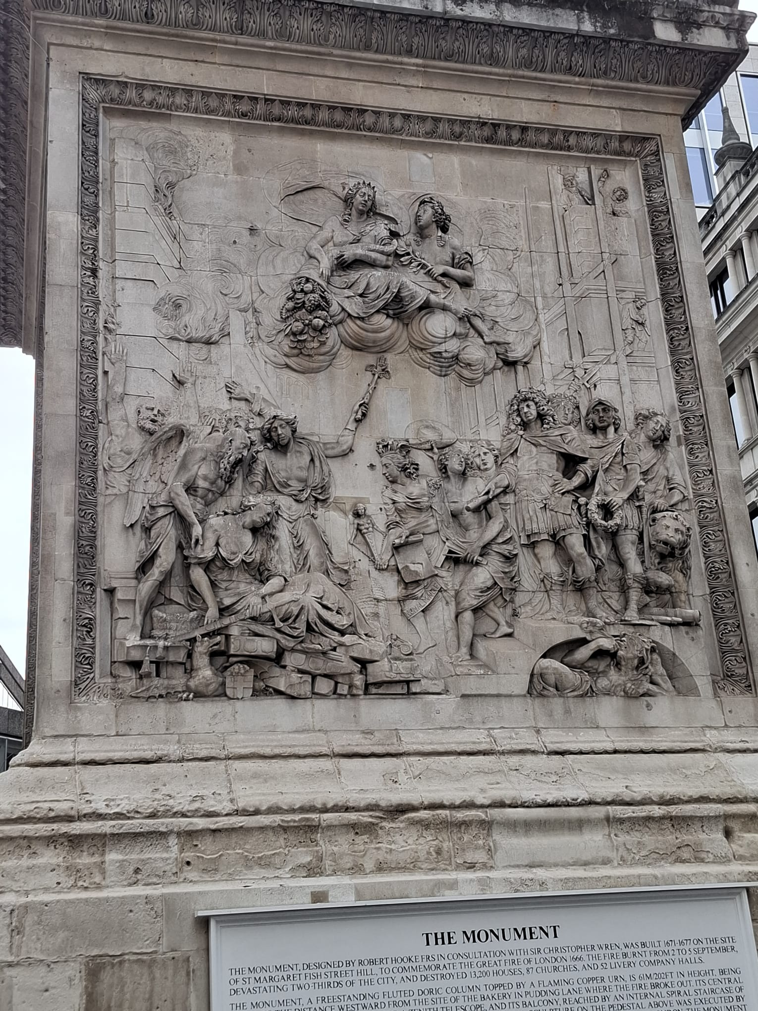 先由大火紀念碑外的石雕畫開始說起。右邊拿著卷軸的男士是查理二世國王,象徵他是親自部署親自指揮救災的領袖,他被建築師和他的弟弟約克公爵( 後來成為King James II)等幫助滅火的人包圍。