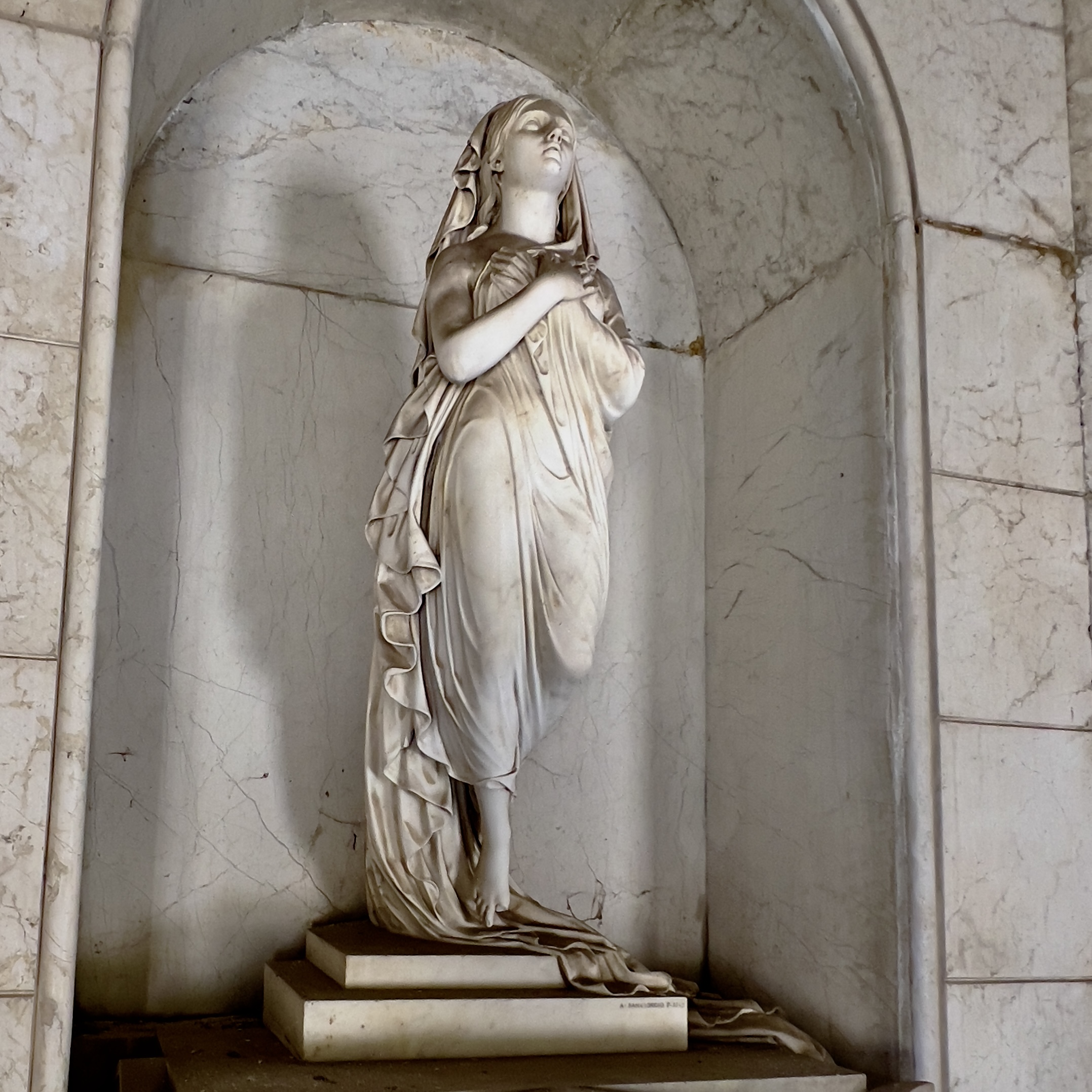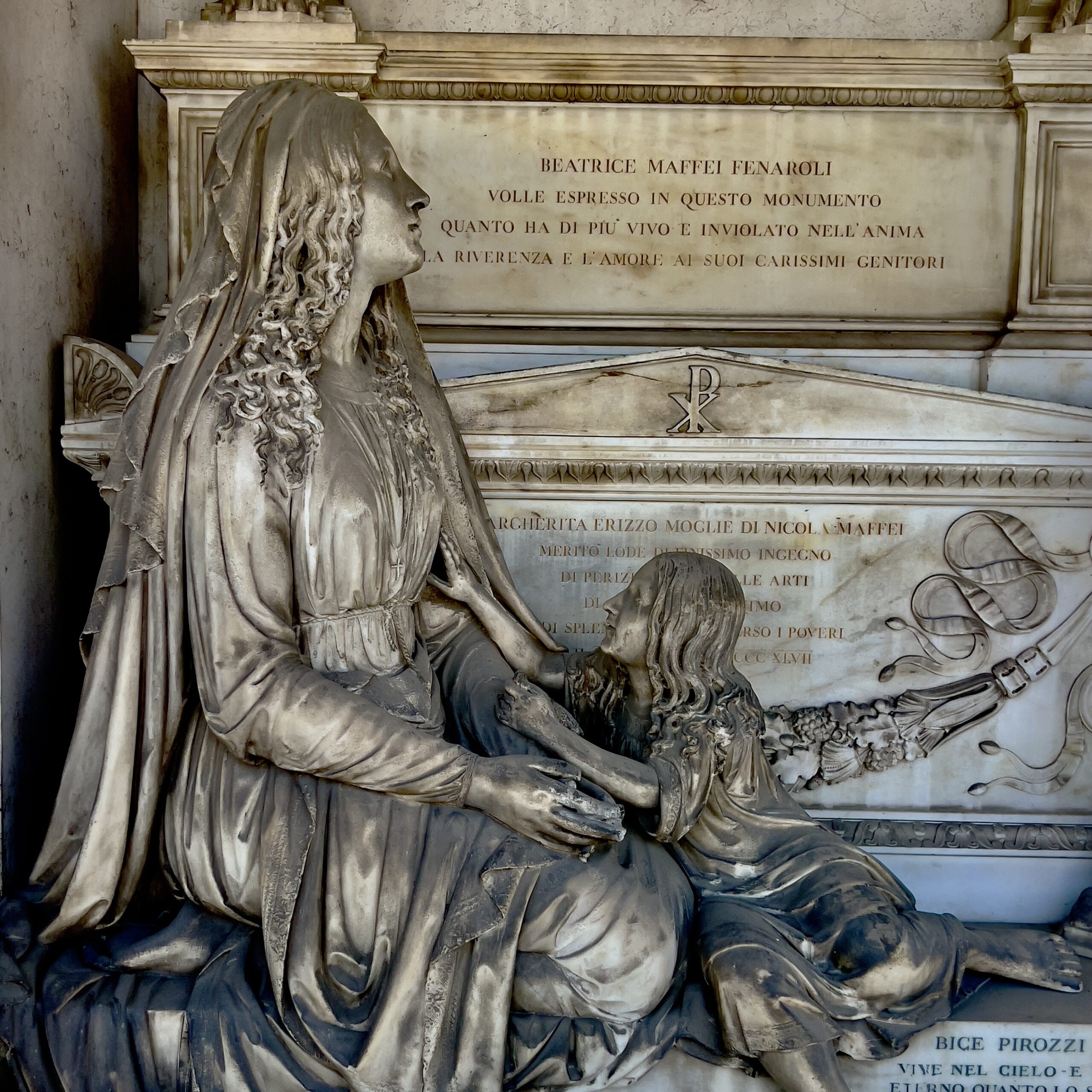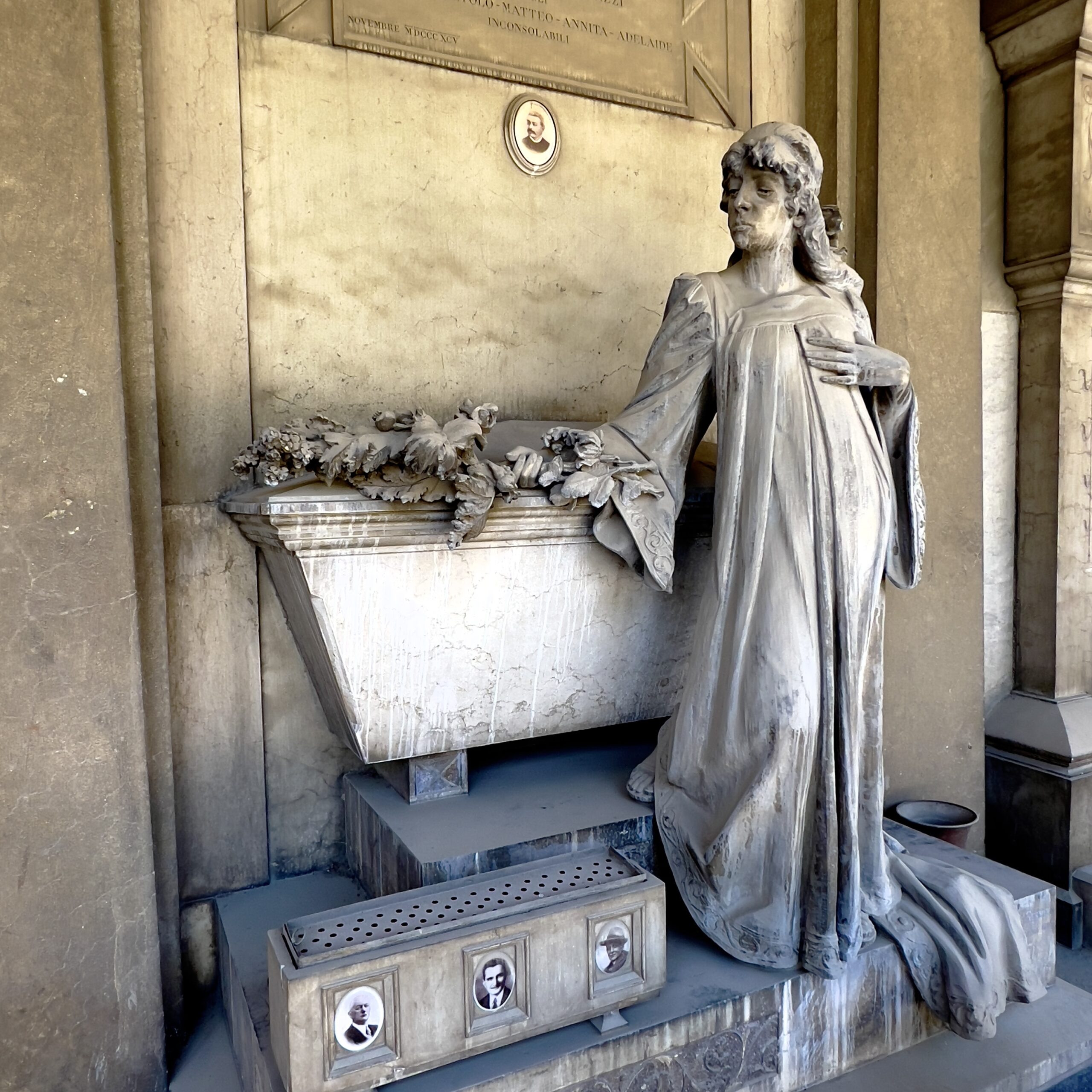 墓園的雕塑主要是新古典主義風格,儘管墳場面積極大,原創性的雕像不太多,也沒有如在米蘭或熱那亞的情色雕像,雖然仍強調人像的感情,但無強烈的悲傷表現,對死亡也沒有特別的恐懼,有種淡然無奈的感覺。