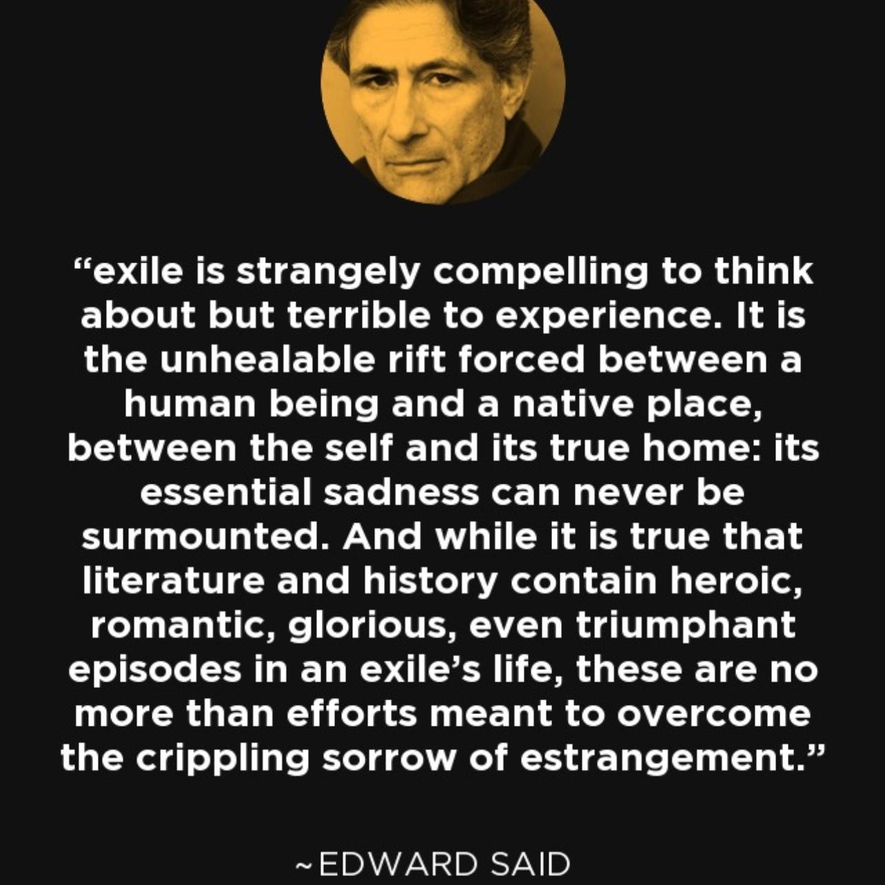 後殖民理論的創始人薩依德(Edward W. Said, 1936-2003)在1994年出版的《知識者代表》(Representations of the Intellectual)一書中探討了流亡問題,直指流亡所帶來的痛苦現象:對某地從未有過歸屬感的人,總是會感到落寞,對過去感到悲傷,對現在及未來感到痛苦。薩依德身為巴勒斯坦人,其族群至今仍然在各地流亡。當然,世上不止他們有流亡的經歷,歷史上最大且持續最長的流亡族群非猶太人莫屬,自從他們離開耶路撒冷以來,已經流亡了兩千多年。