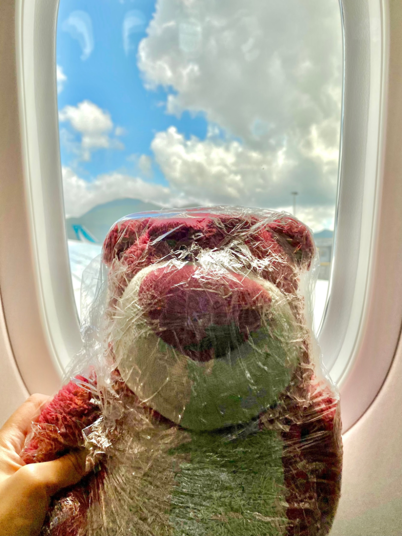 那晚絕望與孤獨感彌漫整屋,我似是在回顧自己出生至今走過的痕跡。我整夜沒睡,一直收拾至清晨的陽光灑進屋內。貼滿整屋的粉色memo紙,隨著窗外吹來的風飄揚,一陣蒼涼。最後,我把床頭的毛公仔用一層層保鮮紙包裹(公仔也要防疫😷),決定抱著它上機,作我流亡路上唯一的陪伴。