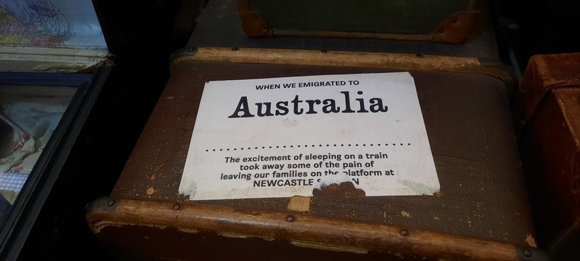 二戰前後,也有不少家庭扶老攜幼離開英國,移民澳洲。在這個火車展館,除了相關照片,在一隻爛皮箱上,還貼上一個移澳小孩的心聲: