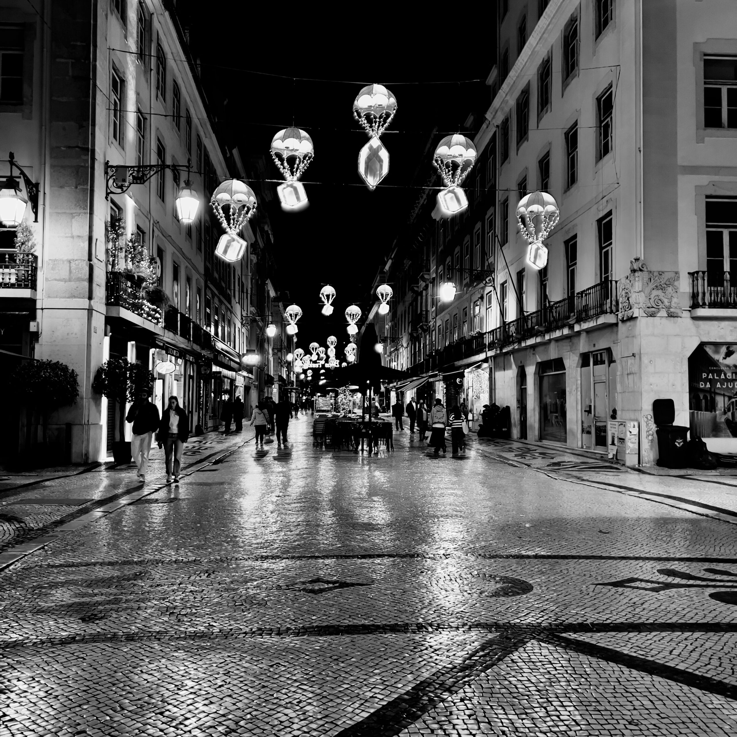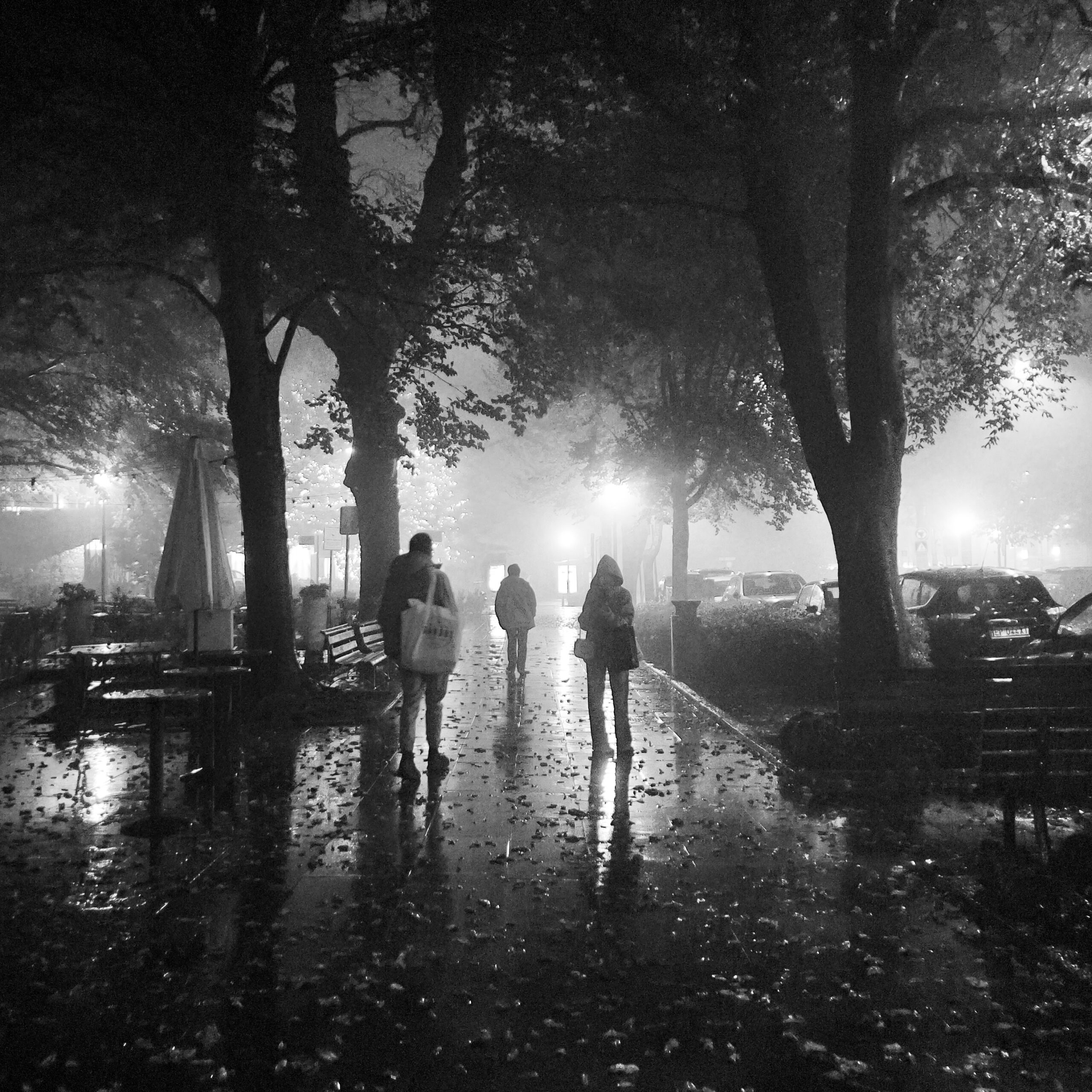 黑白攝相賦予街道夜晚或細雨中景象一種特殊的情感。燈光的閃耀與濕潤的路面交織出獨特的光影效果,讓人感受到時光的流逝與瞬間的靜謐。雨水滲透在街道上,形成了自然的鏡面,映射出周圍建築的輪廓,增添了些許神秘的氛圍。