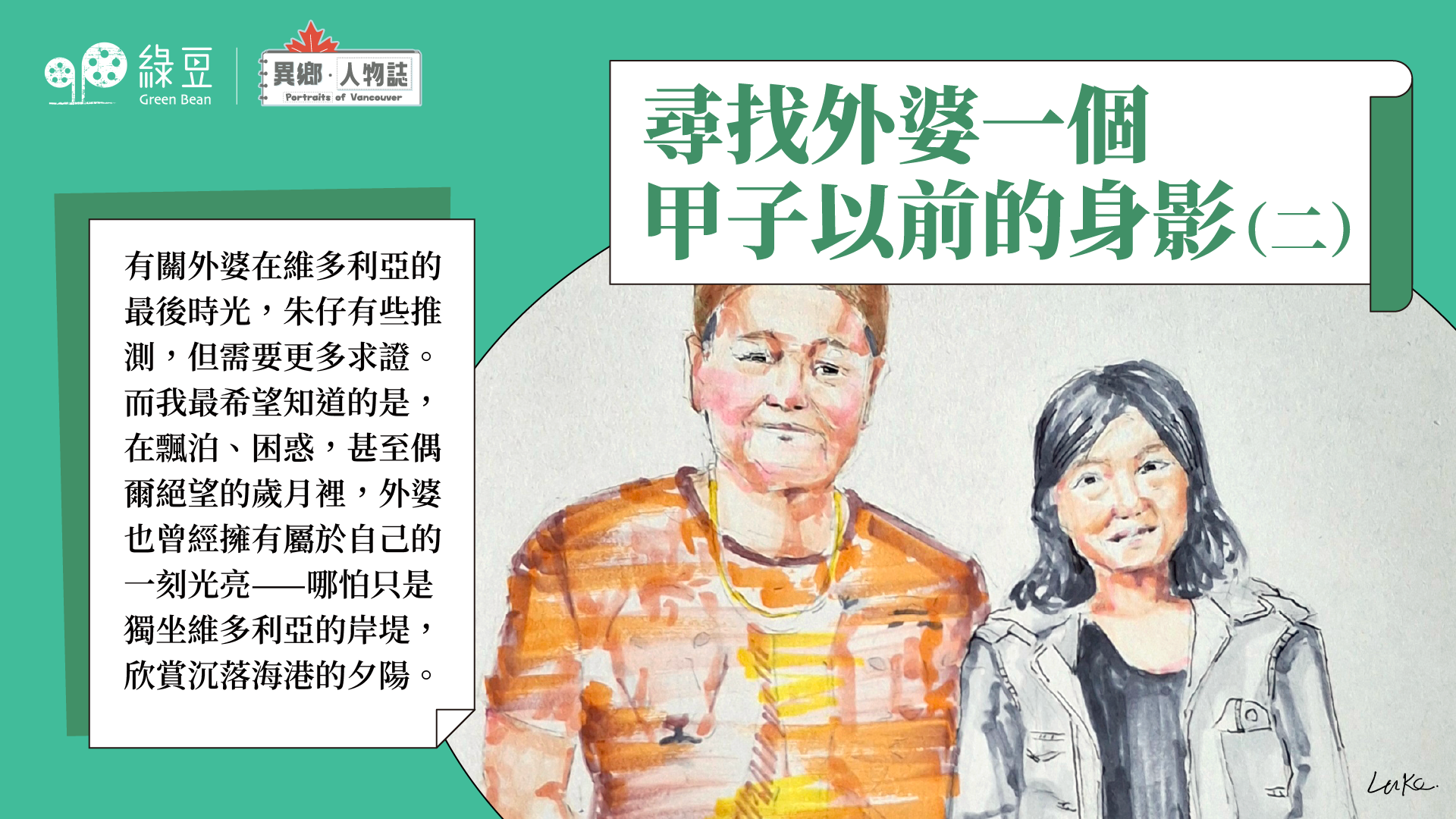 朱漢強(朱仔)尋親的信從溫哥華寄到維多利亞,大約要跑一百公里,但信件背後的機緣,穿山過水,又穿越時空——地址是他姊姊們探訪香港失智的表姨時,從她家中找來的;信裡附的老照片,是朱仔出生以前外婆譚瑞香從維多利亞寄到香港給女兒看的。半個世紀後,它竟又經溫哥華重返維多利亞,送到照片裡擠在兩位女士中間的小男孩手上。讀完信,不再是孩童的長輩把它擱下幾天,稍稍消化,然後回撥電話---- 「我可以帶你去找你外婆的墳,這世上只剩我知道她葬在哪裡了。」朱仔的表舅 Henry Leong 說。 ...