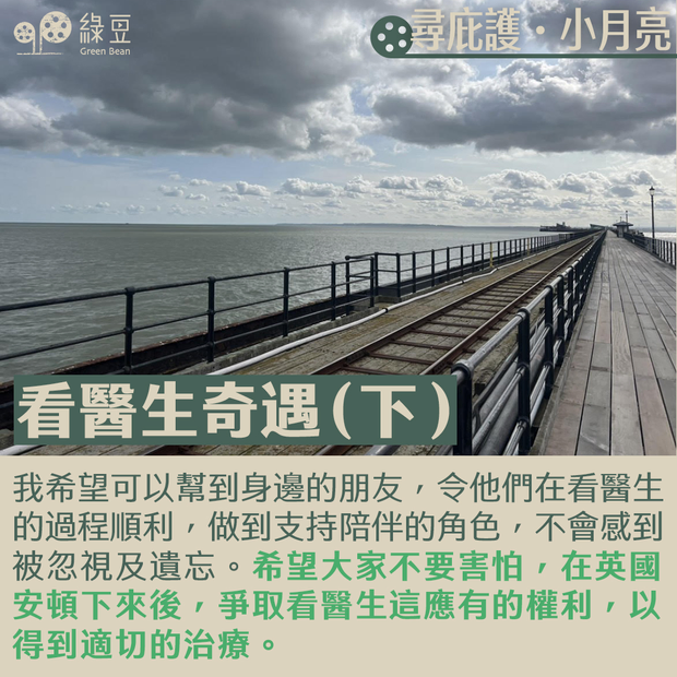• 這次看醫生抽血的經驗的確很不順利,但幸好有朋友支持著及陪伴著。 上一次的抽血樣本不翼而飛,我能做的只有再堅持多次,期望之後的驗血報告回復正常,讓我可以再次服藥,令一切生活都回復正常。感恩的是,我之後的血樣本再沒有不見,成功送去化驗,而且報告是「綠色」,代表白血球回復正常。 而這次看醫生的「奇遇」,令我有很深體會。 我很幸運,起碼在英國的期間,可以免費看醫生取藥及抽血,而且本地醫生願意給我開出跟香港一模一樣的藥物,不需要經歷長時間再調藥的情況,令健康及情緒情況都穩定下來。 但對於很多尋求庇護的朋友,他們的英文溝通能力未必足夠能讓他們順利地與醫護人員交流,因為很多醫療用字都比較艱深。即使英文能力沒問題,他們的治療都可能會被耽誤,醫生未必願意配合,開出一些庇護之前在香港服用的藥物,或是需要再次調藥,過程比較辛苦及漫長。 而在香港未曾正式看過醫生、有確診病歷的朋友,他們更需要經歷繁複的評估,需要多次向醫護人員詳細的表達自己的情況,過程可能會被誤解,語言的困難亦可能影響溝通,表達不全面,或會被標籤,好可能會感到徬徨及無助,加深了孤獨的感覺。...