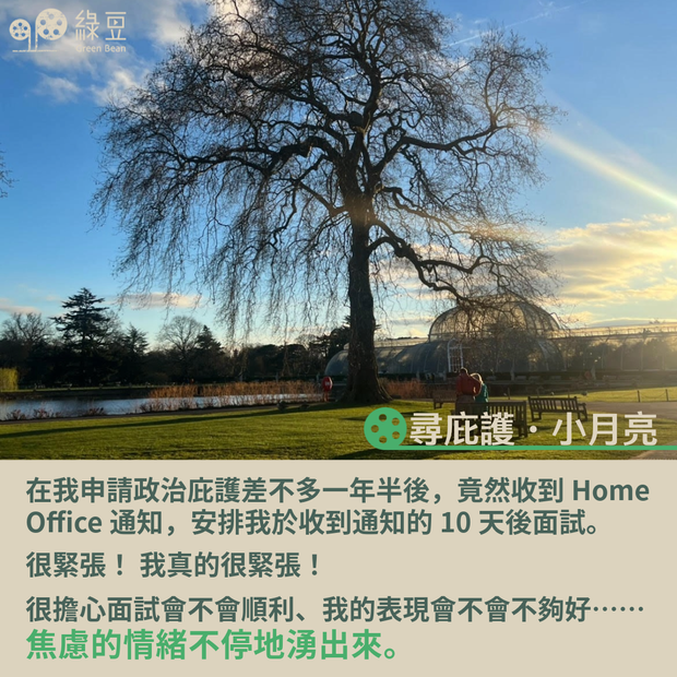 • 雖然隻身來到英國,但是很慶幸在這裡遇到很多很多很好的朋友,大家互相支持。其中在香港人的活動中,我也重遇了一些中學及大學的朋友,而最令我驚喜的是我,可以在這重遇我中學的小師妹。小師妹在高中時候已到美國讀書,然後於大學攻讀電影,畢業後成為了一位出色的攝影師及導演,我一直都很羨慕她的工作,並以她為榮。我在中學時期都有想過讀電影,因為我覺得電影是一樣很有力量及感染力的媒體,可以傳遞很重要的訊息及價值,影響到每一位的觀眾,甚至可以進入大家的內心深處。不過我覺得自己沒有太大的潛質去做電影,最後反而選擇了做一名社工,成為助人專業,接觸生命的故事,與他人同行。不可思議的重遇我已經有一段長時間沒有跟師妹接觸,真的沒有想過可以在英國重遇她,在香港市集一看到這樣熟悉但又十多年沒有見過的臉孔,我忍不住尖叫,衝向她,然後抱著她,我們都覺得這樣的重遇很不可思議,很開心,很驚喜,亦很感動。師妹經常往來英國,在這裡拍攝香港人移居英國的故事,我們有更多的機會一起相處,一起傾訴,分享這些年來的經歷及故事,了解大家的心路歷程。師妹會約我聊天、為我煮甜點、一起去集會遊行,甚至陪我去覆診抽血,一起去見律師,幫助我並給予意見,陪伴我於這段尋求庇護的日子,一步一步向前努力,我真的很感恩。前路的確有很多不明朗,但上天在很多困難的時候都為我送上不同的小天使,還有滿滿的愛和鼓勵,我真的很是幸運。願我身邊的人都平安順利,大家加油!▌[尋庇護]作者簡介過著流亡生活、前景未明的在英尋求政治庇護者或他們的過來人,透過綠豆的破土——這塊自由土壤發聲,以專欄「尋庇護」講述自身的故事、申請政治庇護時遇到的種種程序上、生活上的經歷。