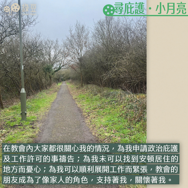 • 媽媽是佛教徒,小時候我常常跟她到佛堂。但到了中學,因為就讀的是有基督教背景的學校,就開始接觸聖經及基督信仰,亦在誤打誤撞的情況下,參與了學校的教會團契及崇拜,正式展開了信仰生涯。當時每個星期六都會回到教會,被教會牧者牧養,亦有事奉工作,成為團契組長,一直在基督和弟兄姊妹的愛裡成長,接近有十年的時間。但之後因為種種原因,自己在美國交流後生病了,與弟兄姊妹的距離也越來越疏遠,也對信仰出現了很多很多的疑問,不明白上帝為什麼容許世界的苦難,不理解人們存在的意義,很多的糾結和疑惑,令自己開始遠離信仰。朋友成為了家人直到來到英國,在朋友的邀請下我再次回到教會,我開始參與本地人及香港人的教會,重新回到教會這個家。一開始我只是想參與聚會,可以跟一大班人聚在一起吃飯聊天。但對教會的一些程序及內容我都感到陌生,祈禱及唱詩歌時都有種不自在的感覺。但漸漸,我找回過往在教會中熟悉的感覺,被滿滿的愛去包圍的感覺。在教會內大家都很關心我的情況,為我申請政治庇護及工作許可的事禱告;為我未可以找到安頓居住的地方而憂心;為我可以順利展開工作而緊張,教會的朋友成為了像家人的角色,支持著我,關懷著我。人生最重要的意義我好像開始重新回到上帝的懷抱,安心地在衪懷裡追尋信仰,慢慢地解開一直以來出現的疑問,建立信心。我可能仍然不完全了解世界出現種種苦難的原因,但我願意去尋問,讓上帝親自回答我。我亦開始找到人生最重要的意義,是去愛,並被愛。人生可能快走到一半,很多的磨練,很多的際遇,很多的關心支持,很多的天使,令我更堅強,亦令我更有力量去愛與被愛。▌[尋庇護]作者簡介過著流亡生活、前景未明的在英尋求政治庇護者或他們的過來人,透過綠豆的破土——這塊自由土壤發聲,以專欄「尋庇護」講述自身的故事、申請政治庇護時遇到的種種程序上、生活上的經歷。