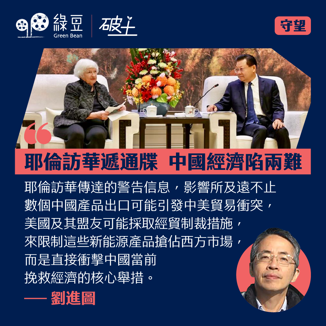 • 過去一周,最矚目的政經要聞是美國財長耶倫訪問北京,向中方傳達強烈警告信息,指美國不會坐視中國輸出過剩產能,以低廉價格搶佔電動車、太陽能板及鋰電池等新能源產品的市場,令美國重蹈十年前國內鋼鐵企業被中國廉價出口打垮、導致大批工人失業的覆轍。這道通牒直接威脅中國振興經濟的計劃,令中國經濟發展陷入進退兩難。 中國經濟正面臨巨大危機,這已是眾所周知的事情:房地產市場泡沫爆破、內需疲弱消費乏力、青年人失業問題嚴重、地方政府債台高築無力投資,過去賴以帶動經濟增長的火車頭幾乎全部失靈,如何走出這個危險的困局,成了各方高度關注的事情。 在三月的全國兩會前後,習近平的第三任政府逐漸透出信息,北京不會沿用過去政策,以財政支出刺激傳統內需(如住房及民生消費),來化解經濟危機,會改為集中力量發展具戰略價值的新興產業(如芯片、新能源),通過擴大製造及出口來帶動增長,這些戰略產業的拳頭產品,正正包括電動車、太陽能光伏板、鋰電池等,習近平稱呼這些領域為「新質生產力」,予以大力宣傳。 中國的兩難 換言之,耶倫訪華傳達的警告信息,影響所及遠不止數個中國產品出口可能引發中美貿易衝突,美國及其盟友可能採取經貿制裁措施(例如大幅增加關稅),來限制這些新能源產品搶佔西方市場,而是直接衝擊中國當前挽救經濟的核心舉措。 中國如果堅持原來方針,加碼押注在這些新興產業上,一旦出口受阻,過剩的產能無法疏洩,就會堵塞在內地,可能引發割喉式減價促銷,觸發一大批實力較次的企業倒閉,造成大量工人失業。如果北京修改原來的戰略,重返保傳統經濟、保民生就業的舊路,習近平的威信和聲望固然會大受打擊,藉著催谷高新科技產業,來抗衡西方以科技封鎖遏制中國發展的全盤策略也會崩潰。 拖延與分化...