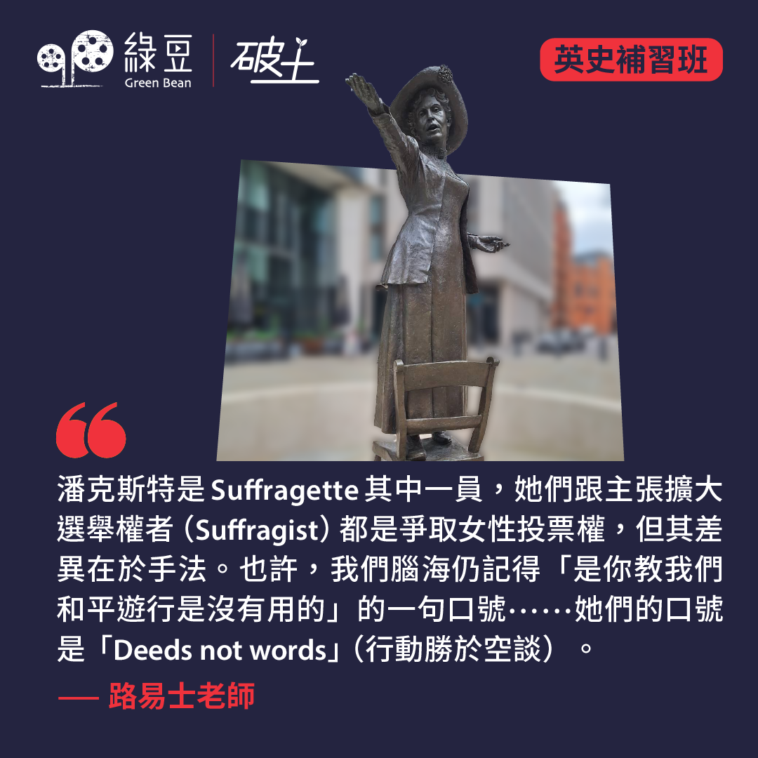 路易士老師在香港已喜歡走路,讓眼睛旅行,在英國也不改這習慣。夏天的英國是最適宜散步了,不冷不熱,漫步街頭,迎接未知的人和事,一樂也。最近就跟朋友在倫敦的羅素廣場(Russell Square)附近走走,在街角看到一個藍色的牌子(稱為blue plaque),寫著「Emmeline Pankhurst 1858 -1928」。路易士老師心頭一震,這個名字可不易讀!港人在英國做老師,往往晚上要查生字讀音,實在有不足為外人道的唏噓,但學習了的東西,總是自己的。街角上的藍牌子,旁人或會匆匆走過,我就看得別有滋味,這就是學習的樂趣。原來這位「社運人士」跟她的女兒 Christabel...