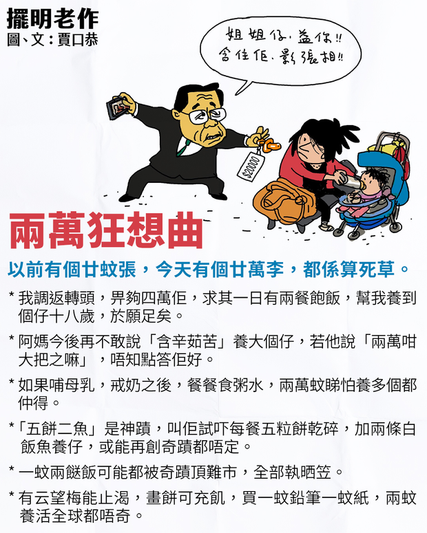 以前有個廿蚊張,今天有個兩萬李,都係算死草。 * 我調返轉頭,畀夠四萬佢,求其一日有兩餐飽飯,幫我養到個仔十八歲,於願足矣。 * 阿媽今後再不敢說「含辛茹苦」養大個仔,若他說「兩萬咁大把之嘛」,唔知點答佢好。 * 如果哺母乳,戒奶之後,餐餐食粥水,兩萬蚊睇怕養多個都仲得。...