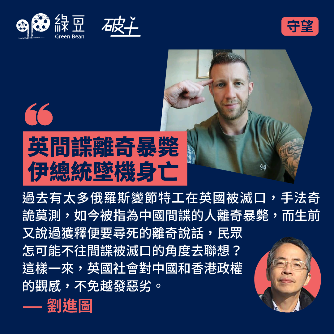 過去一周,最矚目的要聞有兩則,其一是伊朗總統易卜拉欣萊希和隨行高級官員乘坐的直升機在惡劣天氣下墜毀,中國網絡媒體上有聲音把事件歸咎於美國和以色列。而官方輿論則以習近平的慰問唁電為導向,高度讚揚萊希;另一則是上周被英國指控替香港當間諜的英國人Matthew Trickett被發現死在公園裡,官方聲明指死因不明,有待調查。而英國媒體報道則披露,他在獲准保釋前曾自殘,並向獄卒透露若獲釋將結束自己生命,令他的暴斃更顯離奇。伊朗總統墜機伊朗總統突然死亡,中美兩國有截然不同的反應。在中國方面,習近平迅速向伊朗第一副總統穆赫貝爾致唁電,說萊希就任以來,為維護伊朗安全穩定、促進國家發展繁榮作出重要貢獻,也為鞏固和深化中伊全面戰略伙伴關係作出積極努力。習近平稱其不幸遇難是伊朗人民的巨大損失,也使中國人民失去了一位好朋友。這則唁電被新浪微博熱搜強制置頂,而「伊朗總統遇難」這話題也長時間保持在熱搜榜上前列位置,突顯了官方的輿論導向。美國之音的報道指出,中國門戶網站中華網旗下軍事頻道的微博帳戶在貼文中說,伊朗總統墜機身亡的事故機型為美國製造,真相撲朔迷離。中國官方中新網則說,由於西方長期制裁,伊朗航空業步履維艱,事故頻發,該報道援引美國CNN的軍事分析指,難以獲得備件或是導致這次空難的原因之一。中國官方《環球時報》也援引CNN報道,一名美國前軍官表示墜機事件與美國制裁有關聯。而中國的國際問題專家金燦榮則援引伊朗媒體的說法,指事故不排除美國和以色列的因素。這些猜測與美國官方反應形成強烈對比,美國國防部長勞埃德奧斯丁在5月20日的記者會上,被問及是否擔心萊希喪命會歸咎美國時說,「美國在這場墜機事故中沒有扮演任何角色」。中美兩國對伊朗墜機事故的不同反應,突顯了當前中美矛盾相當尖銳。伊朗是美國的敵人,長期受美國制裁,而中國則是伊朗的盟友,在西方封鎖下為伊朗提供經濟支持。中國官方對伊朗總統的評價,以致中國網絡媒體的評述,客觀效果就是令西方社會更加認定,中國與俄羅斯及伊朗是鐵杆盟友,俄羅斯侵佔烏克蘭,威脅整個歐洲安全,而伊朗則不斷在中東地區策動代理人燃點戰火,令中東局勢不穩,影響正常貿易航運。當中國被鎖定為俄羅斯與伊朗的鐵杆盟友,中國想要改善與美國和歐盟的關係便會加倍困難。英國間諜案至於英國間諜案方面,主流媒體的報道對中國和香港也相當不利。在Matthew Trickett離奇死亡之前,英國主流媒體的報道焦點,在於三名被告受僱替中國和香港情報部門工作,對在英國人士進行政治監控,觸犯了英國國安法中協助外國進行干預的規定。這宗檢控個案受到廣泛報道,從英國傳媒的跟進報道可以看出,事件受到重視有兩大理由,其一是受僱進行跟蹤監視的兩名英國公民曾任職軍隊、警隊、內政部等敏感部門,這些部門據報已加強戒備,採取反滲透行動,預示可能揭出更多案件。另一個理由是被告袁松彪任職港府駐倫敦經貿辦,經貿辦過去一向享有外交特權,若庭審後證實淪為間諜窩,特權會否被撤銷?此外,英國國會在今年底前便要改選,保守黨和工黨都要努力營造會強勢捍衛英國安全的形象,這個時節爆出轟動的間諜案,執政和在野政黨都傾向強硬回應。中國雖然大力抗議,說英方編造案件,無理指責特區政府,但英國政府毫不賣帳,英國媒體分析說,其實中國間諜活躍英倫並非新事,只是過去英國政府為免影響英中經貿關係,一般低調處理,大事化小,如今迅速告上法庭,顯示不再寛鬆處理,已曝光個案相信只是冰山一角。如今,三名被告之一突然在公園暴斃,而且據報他在保釋前向獄卒透露,若恢復自由,會了結自己生命,控方據此一度反對保釋。英國主流媒體這則報道,令本來已相當懸疑的間諜案變得更離奇,怎會有被拘留的被告人預言重獲自由便會自盡?這樣的情節,予英國民眾的印象就是,當事人知悉一些重大機密,怕離開拘留所後會被滅口,可能被迫自盡。為什麼英國民眾會有這樣的聯想?因為過去有太多俄羅斯變節特工在英國被滅口,手法奇詭莫測,如今被指為中國間諜的人離奇暴斃,而生前又說過獲釋便要尋死的離奇說話,民眾怎可能不往間諜被滅口的角度去聯想?這樣一來,英國社會對中國和香港政權的觀感,不免越發惡劣。 ▌[守望]作者簡介劉進圖生於香港,七零年代入讀善導小學和九龍華仁書院,學會追求良善、自由和責任。八十年代初進香港大學唸法律,思考社會公義。八十年代末加入新聞行業,先後任職於《信報》及《明報》,切身體會「無信不立」、「兼聽則明」。2014年2月遇襲受傷,病榻上總結心願:「真理在胸筆在手,無私無畏即自由」。