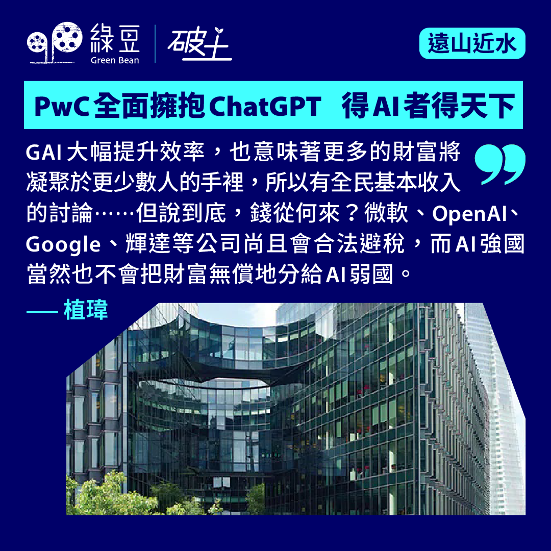 生成式人工智能(GAI)可大幅提升人類的生產力已是不爭的事實。當全球四大會計師事務所PwC (普華永道)也宣布要大規模引入GAI之際,作為人類的我們面對這股AI狂潮,只能奮力向前,在未有全民基本收入 (Universal Basic Income)之前,全民學習GAI以保持競爭力。PwC周三(5月29日)宣布,成為ChatGPT第一個企業方案經銷商,向其成千上萬的企業客戶銷售ChatGPT的企業方案。同時PwC在美國的7.5萬名員工及英國的2.6萬名員工也將使用ChatGPT,佔PwC全球員工30.8%。此前,OpenAI的企業用戶僅為60萬人,單PwC這一個客戶,就帶來16.7%的企業用戶增長。PwC美國業務去年就制定了三年AI投資大計,於2023至2026間初步投資10億美元。PwC 的GAI主管Bret Greenstein...